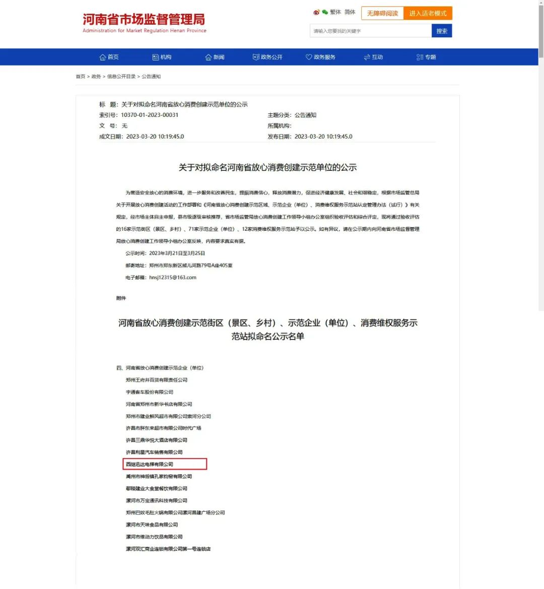 日前,河南省放心消費(fèi)示范單位認(rèn)定工作結(jié)果揭曉,從河南省市場監(jiān)督管理局官網(wǎng)獲悉,西繼迅達(dá)電梯有限公司被評為“河南省放心消費(fèi)創(chuàng)建示范企業(yè)”。