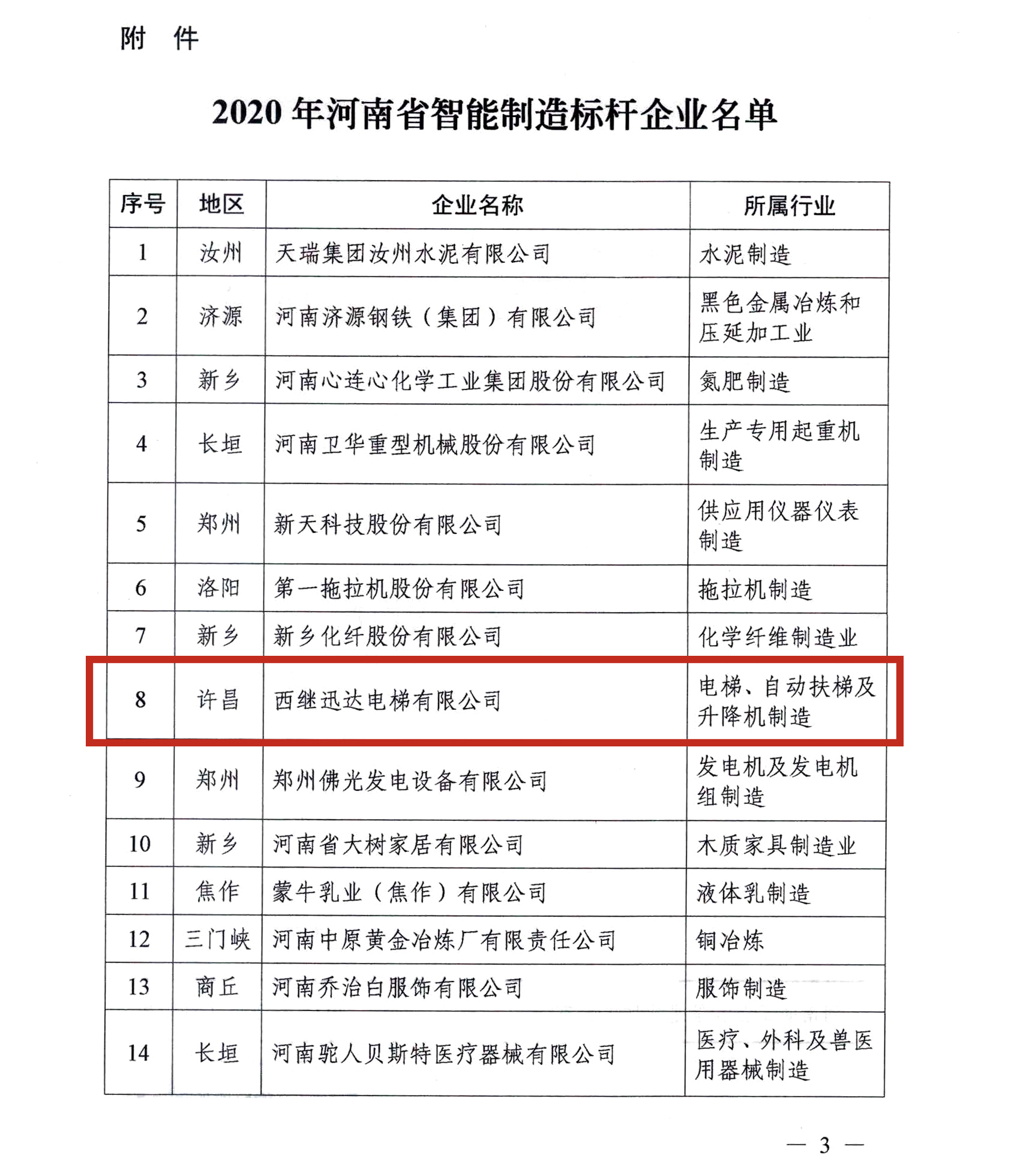 河南省智能制造標(biāo)桿企業(yè)遴選工作于2020年3月份開始,評定工作根據(jù)豫工信辦產(chǎn)融〔2020〕221號文件《河南省工業(yè)和信息化廳辦公室關(guān)于開展2020年智能制造標(biāo)桿企業(yè)遴選工作的通知》要求,經(jīng)各地工業(yè)和信息化主管部門推薦,省工業(yè)和信息化廳組織專家進(jìn)行材料評審、現(xiàn)場核查。2021年1月26日,河南工信公眾號發(fā)布《2020年河南省智能制造標(biāo)桿企業(yè)擬確定名單公示》,將遴選出的西繼迅達(dá)電梯等14家河南省智能制造標(biāo)桿企業(yè)名單予以公示。2月1日,河南省工信廳下發(fā)豫工信產(chǎn)融【2021】9號文件《關(guān)于印發(fā)2020年河南省智能制造標(biāo)桿企業(yè)名單的通知》,最終確定西繼迅達(dá)電梯等14家企業(yè)為2020年河南省智能制造標(biāo)桿企業(yè),印證了公司在智能制造與生產(chǎn)方面的雄厚實(shí)力,已經(jīng)得到社會(huì)各界的充分認(rèn)可。