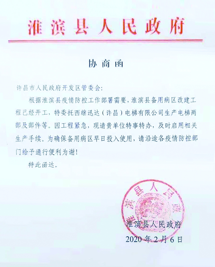 2月6日:淮濱縣人民政府發來函件,根據淮濱縣疫情防控工作部署需要,淮濱縣人民醫院康寧醫院急需開展改建工程電梯安裝工作,特委托西繼迅達盡快安排生產電梯及部件等。