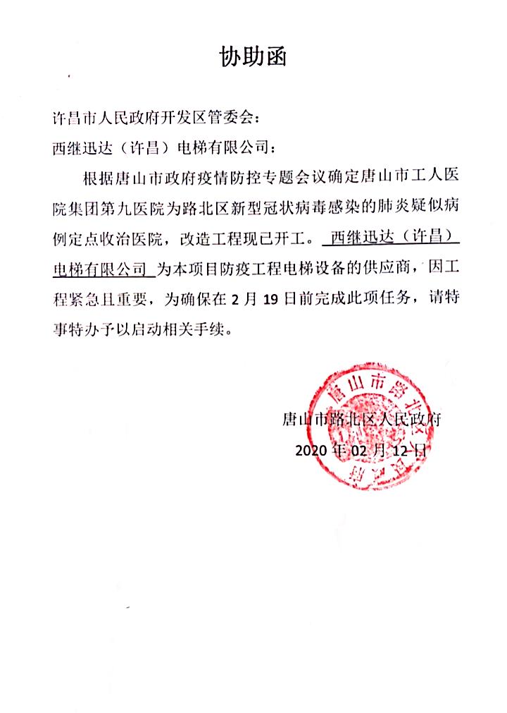 2月12日:唐山市路北區人民政府發來函件,為應對疫情而確定的路北區疑似病例定點收治醫院,唐山市工人醫院集團第九醫院急需開展改造工程電梯安裝工作,西繼迅達為該項目防疫工程電梯設備的供應商,為確保項目建設進度需要,希望西繼迅達盡快安排生產。