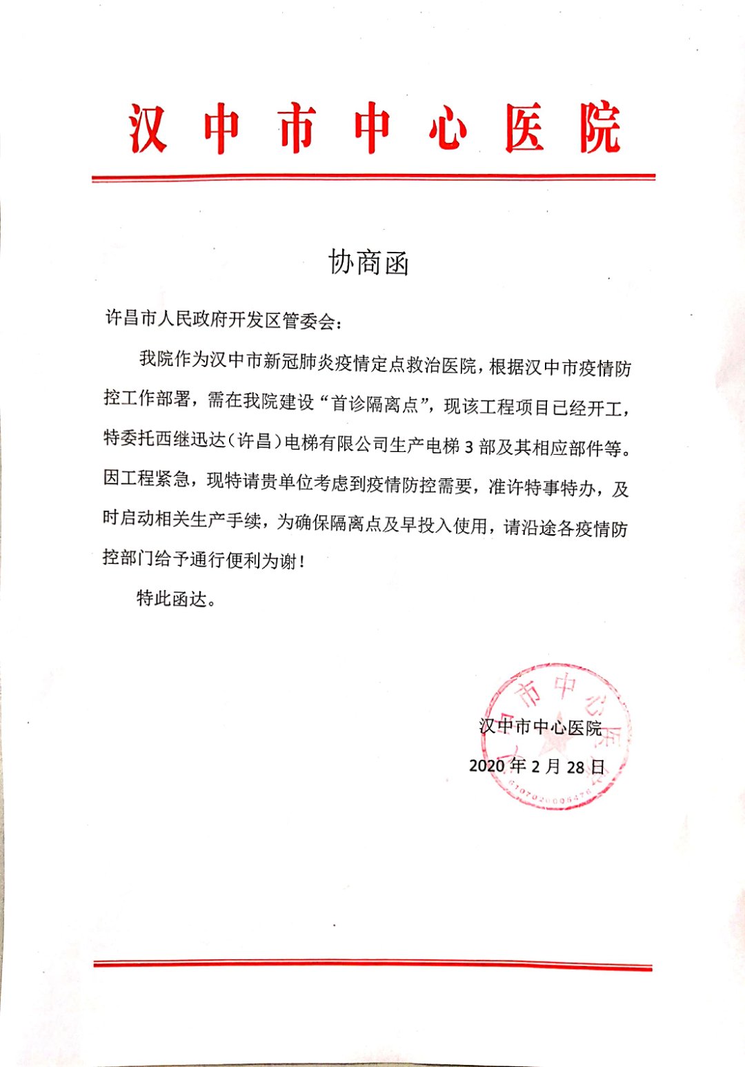 2月28日:漢中市中心醫院給許昌市開發區管委會發來協助函,根據漢中市疫情防控工作部署,漢中市中心醫院被列為漢中市新冠疫情定點救治醫院,該院需建設“首診隔離點”,特委托西繼迅達電梯生產3部電梯及部件。因工程緊急,特請特事特辦。