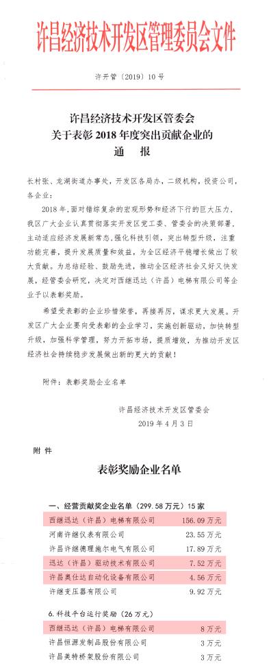 4月12日,西繼迅達(dá)電梯在經(jīng)濟(jì)技術(shù)開(kāi)發(fā)區(qū)管委會(huì)召開(kāi)的2019年度工作會(huì)議上,被開(kāi)發(fā)區(qū)管委會(huì)通報(bào)表?yè)P(yáng),授予經(jīng)營(yíng)貢獻(xiàn)獎(jiǎng),并給予156萬(wàn)元現(xiàn)金獎(jiǎng)勵(lì),位列經(jīng)營(yíng)貢獻(xiàn)獎(jiǎng)企業(yè)首位。此外,西繼迅達(dá)還被授予8萬(wàn)元科技平臺(tái)運(yùn)行獎(jiǎng)勵(lì)。